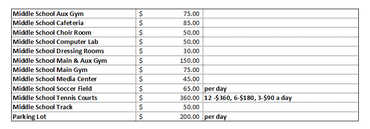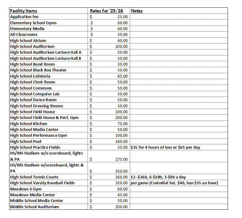 **Prices are per hour unless stated otherwise. All renters must provide liability insurance*. An application fee is also required for all rentals, the cost is $25. Additional fees such as custodial, supervisory or maintenance may be incurred depending on the type of use as well as group needs/size. Novi Community School District, through the Community Education Office, has the right to assess fees as deemed necessary.